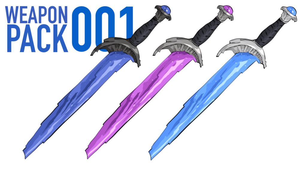 This weapon pack was made with a certain theme and setting in mind but you can also think of your own to fit your world. Each individual pack contains 3 variants of the weapon's color with version 1 being the original that's meant to fit the theme. Also included is the PSD for the weapon so you can customize the colors yourself.